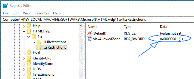 - Locate and then click the following subkey: HKEY_LOCAL_MACHINE\SOFTWARE\Microsoft\HTMLHelp\1.x\ItssRestrictions